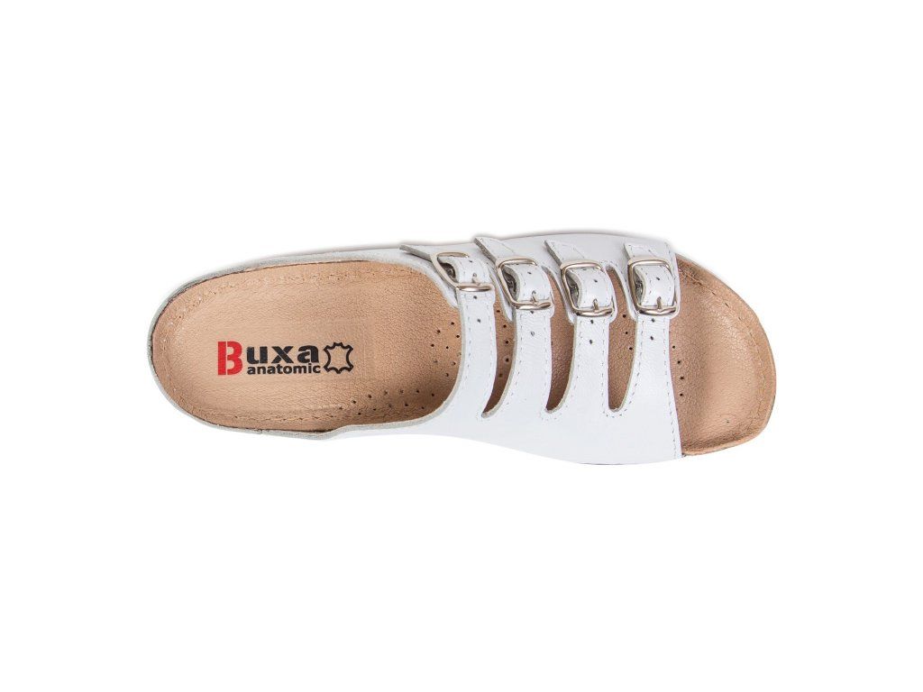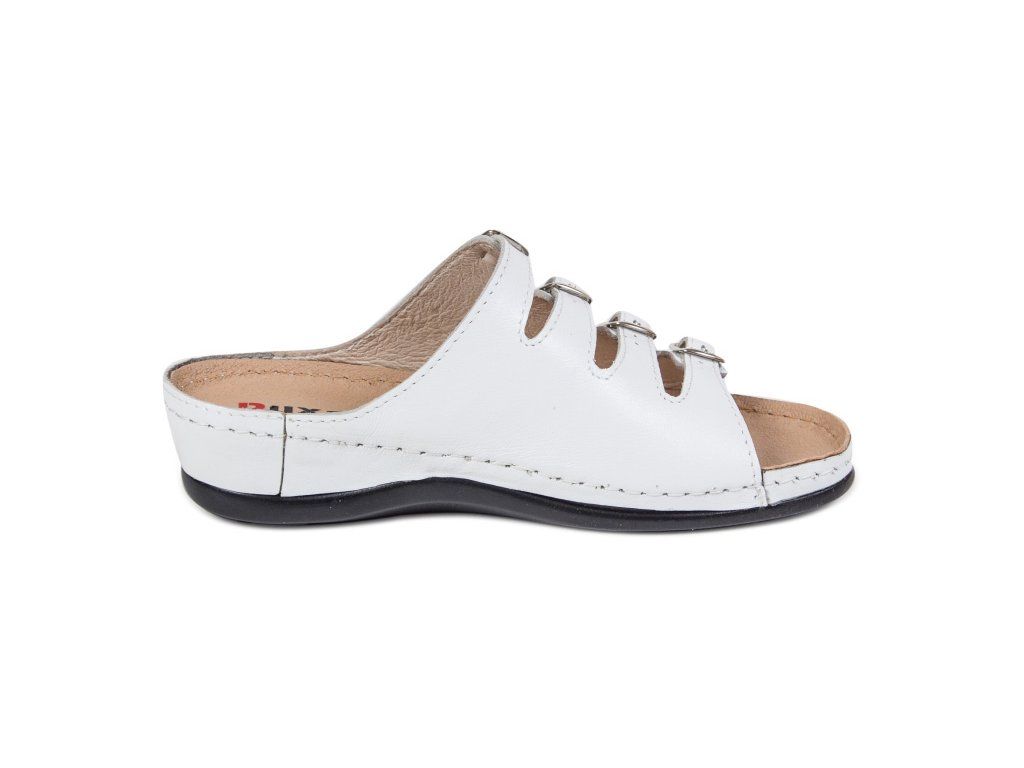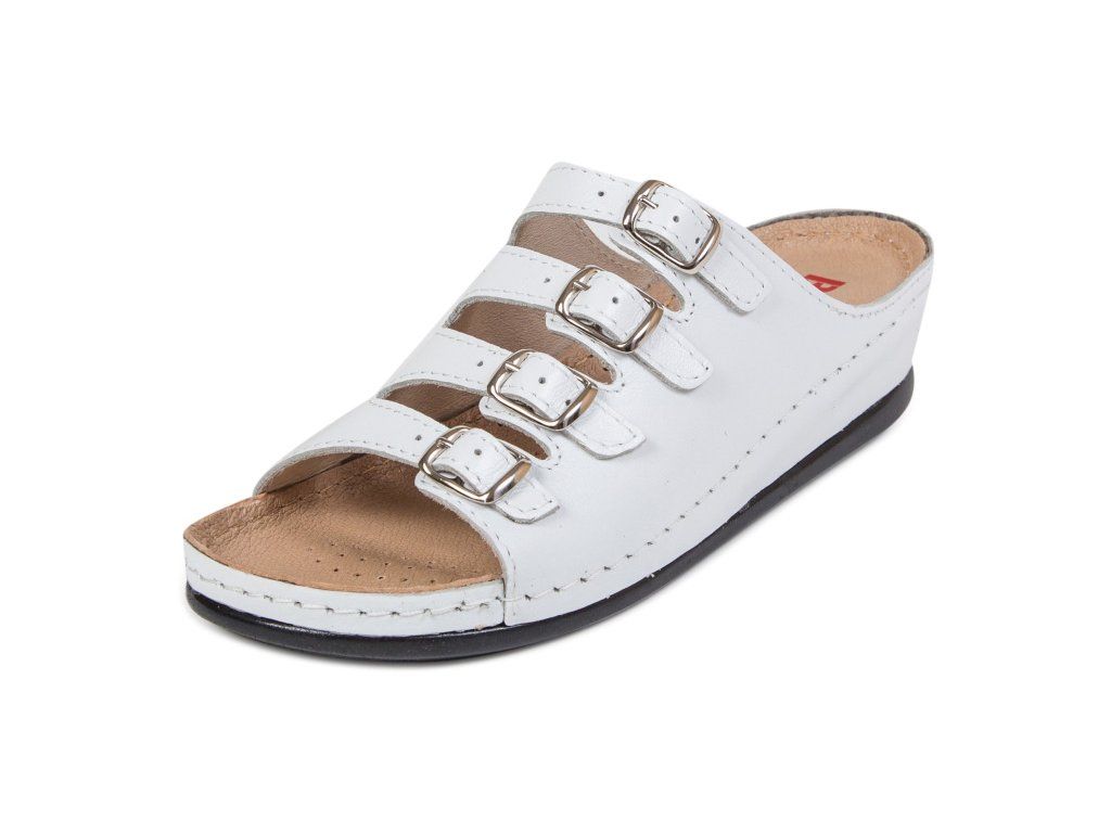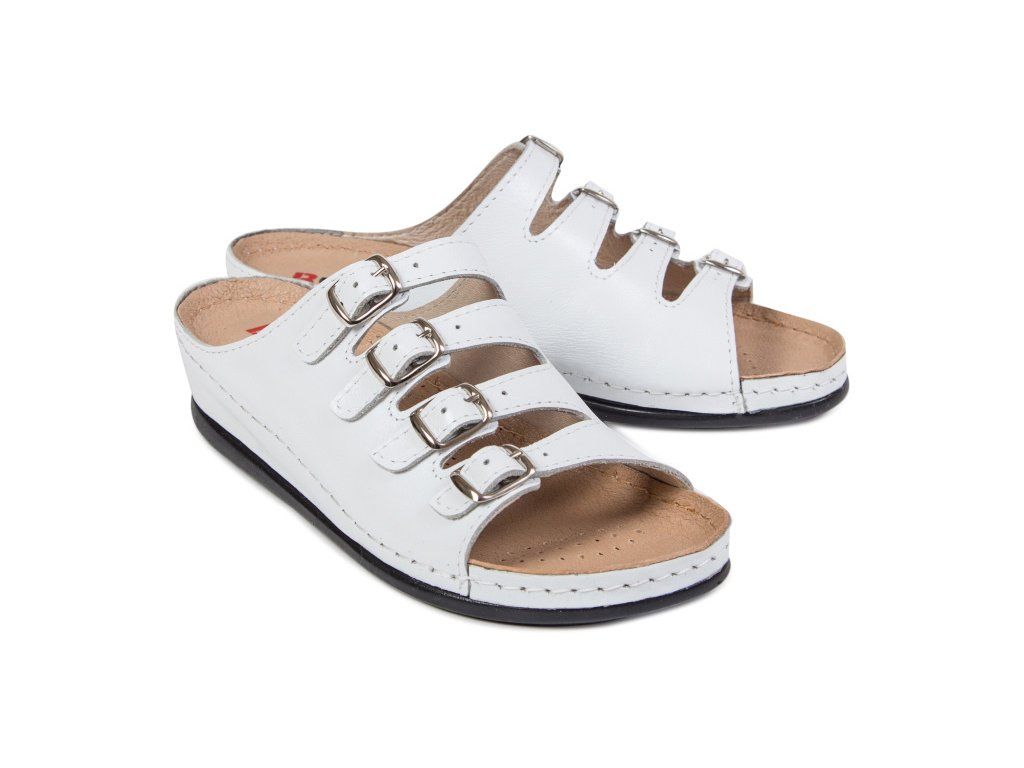 Női, teljes egészében bőrből készült egészségügyi papucs. Ez a modell puha, anatómiailag kialakított talpbetéttel rendelkezik, amely megtámasztja a láb haránt- és hosszboltozatát, valamint a lábujjakat is. Kiváló minőségű, sima felületű valódi bőrből készült. Hosszú évek tapasztalata alapján tervezték dolgozó szakemberek számára. Tartós, biztonságos és kényelmes papucs, amely megfelel a professzionális lábbelikre és védelemre vonatkozó európai előírásoknak. Egészségügyi, munkavédelmi, otthoni és hétköznapi nyári viseletként is ideális. Egész napos viselésre is megfelelő.