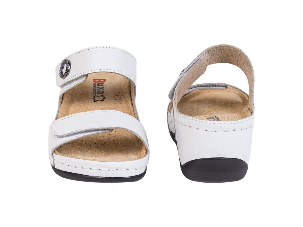 Női, teljes egészében bőrből készült egészségügyi papucs. Ez a modell puha, anatómiailag kialakított talpbetéttel rendelkezik, amely megtámasztja a láb haránt- és hosszboltozatát, valamint a lábujjakat is. Kiváló minőségű, sima felületű valódi bőrből készült. Hosszú évek tapasztalata alapján tervezték dolgozó szakemberek számára. Tartós, biztonságos és kényelmes papucs, amely megfelel a professzionális lábbelikre és védelemre vonatkozó európai előírásoknak. Egészségügyi, munkavédelmi, otthoni és hétköznapi nyári viseletként is ideális. Egész napos viselésre is megfelelő.