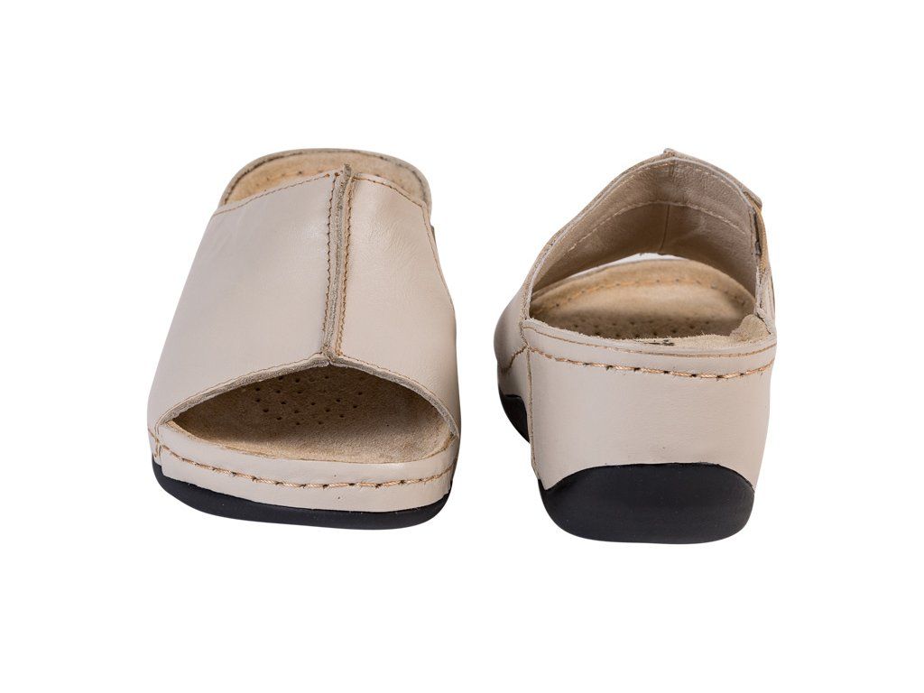 Női, teljes egészében bőrből készült egészségügyi papucs. Ez a modell puha, anatómiailag kialakított talpbetéttel rendelkezik, amely megtámasztja a láb haránt- és hosszboltozatát, valamint a lábujjakat is. Kiváló minőségű, sima felületű valódi bőrből készült. Hosszú évek tapasztalata alapján tervezték dolgozó szakemberek számára. Tartós, biztonságos és kényelmes papucs, amely megfelel a professzionális lábbelikre és védelemre vonatkozó európai előírásoknak. Egészségügyi, munkavédelmi, otthoni és hétköznapi nyári viseletként is ideális. Egész napos viselésre is megfelelő.