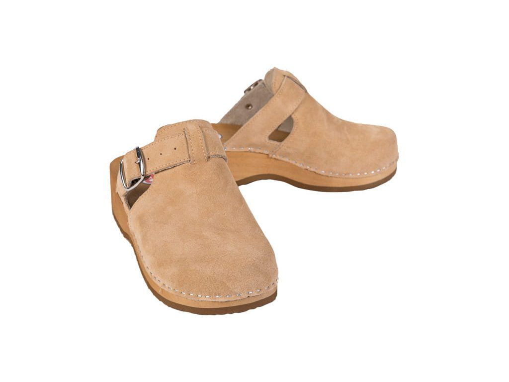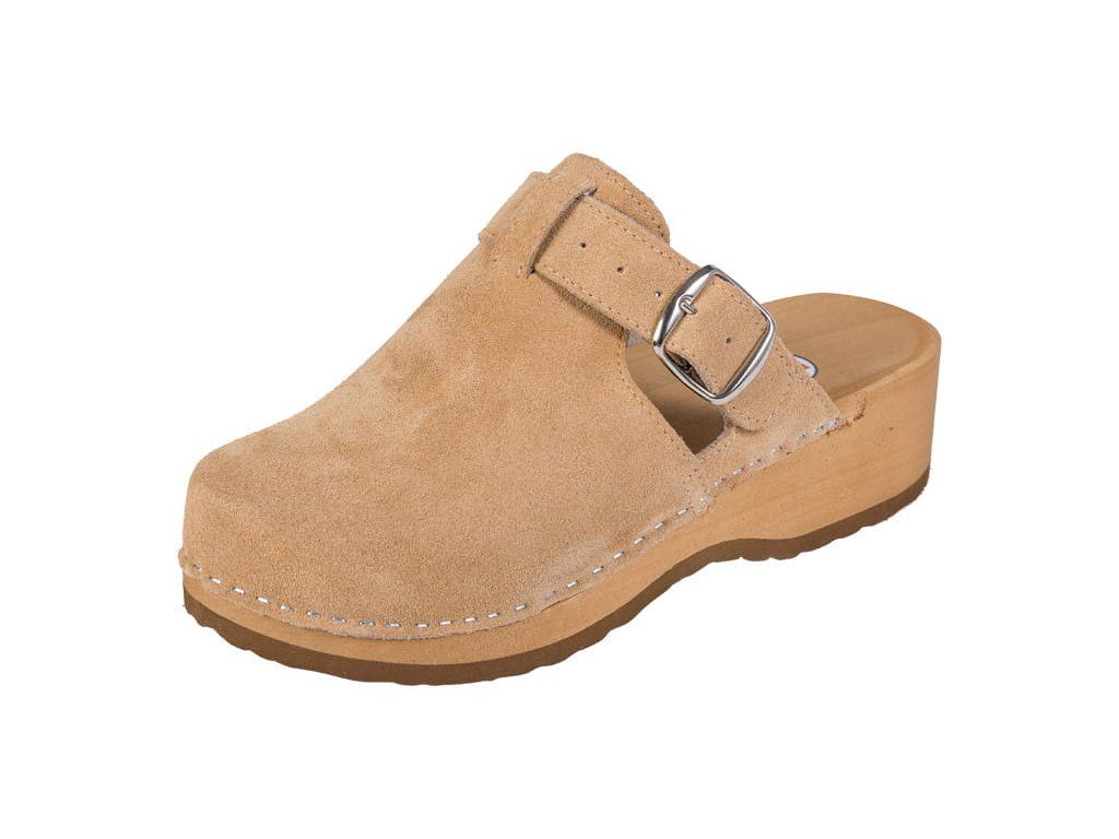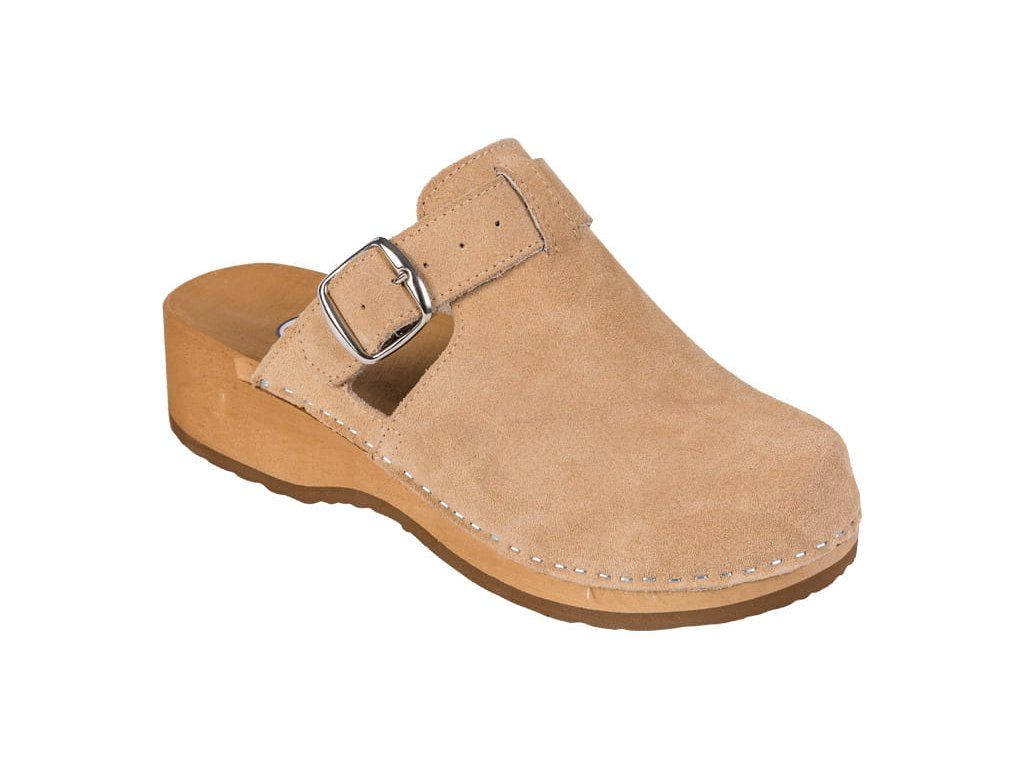 A kényelmes egészségügyi klumpa valódi bőrből és könnyű hársfából készült. A formázott talp segít korrigálni a lúdtalpat. A fa talpbetét használat közben nem deformálódik, és elősegíti a helyes testtartást.