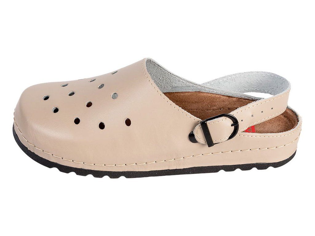 Az anatómiai kialakítású talp támogatja a hosszanti és a haránt boltozatot, sarokkialakítással rendelkezik, valamint finom gördülő elemet tartalmaz a lábujjak alatt, amely segíti a természetes lépést. A megemelt oldalsó szélek és a szélesebb G½ kialakítás miatt ez a modell teltebb lábfejhez vagy nagyobb helyigényű lábhoz is megfelelő. A forgatható pánt kétféle viselést tesz lehetővé — a rüsztön a könnyebb felvétel érdekében, vagy a sarokra helyezve a maximális stabilitásért. A finom mintázatú, csúszásmentes gumitalp biztos lépést garantál igényes munkakörnyezetben is, például klinikákon, laboratóriumokban vagy sima padlófelületeken történő gyors mozgás során.