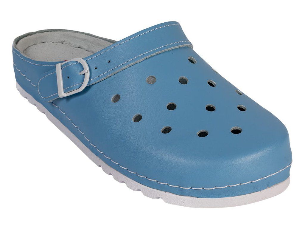 Az anatómiai kialakítású talp támogatja a hosszanti és a haránt boltozatot, sarokkialakítással rendelkezik, valamint finom gördülő elemet tartalmaz a lábujjak alatt, amely segíti a természetes lépést. A megemelt oldalsó szélek és a szélesebb G½ kialakítás miatt ez a modell teltebb lábfejhez vagy nagyobb helyigényű lábhoz is megfelelő. A forgatható pánt kétféle viselést tesz lehetővé — a rüsztön a könnyebb felvétel érdekében, vagy a sarokra helyezve a maximális stabilitásért. A finom mintázatú, csúszásmentes gumitalp biztos lépést garantál igényes munkakörnyezetben is, például klinikákon, laboratóriumokban vagy sima padlófelületeken történő gyors mozgás során.