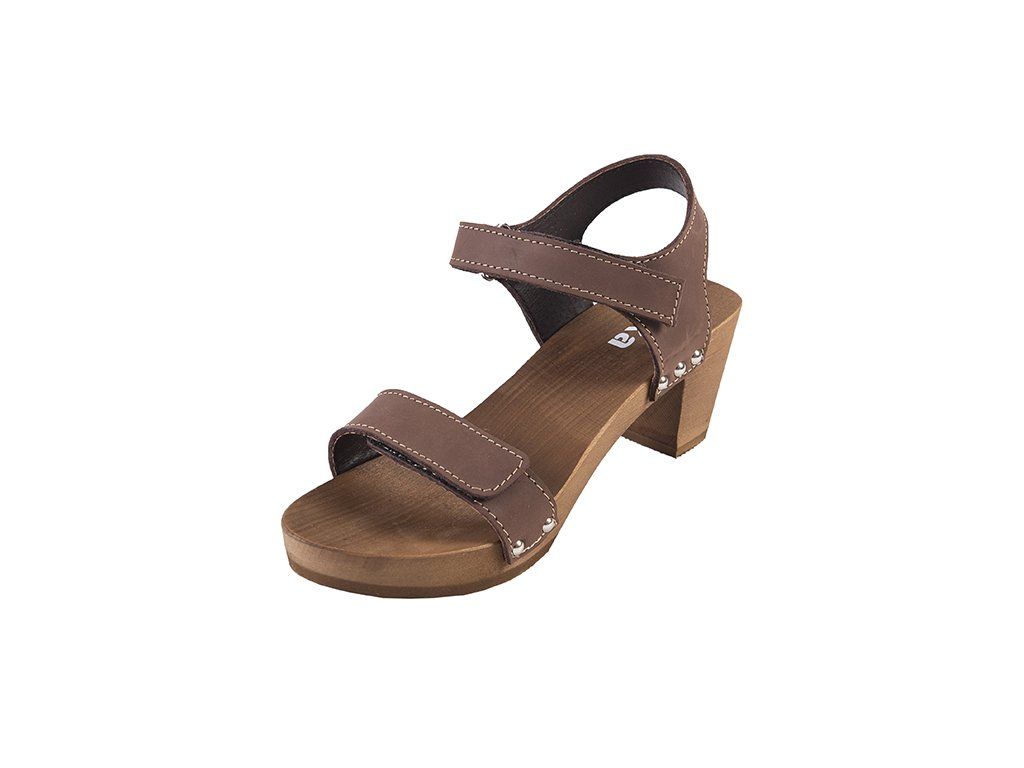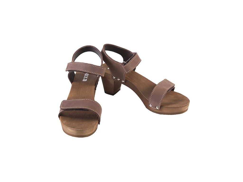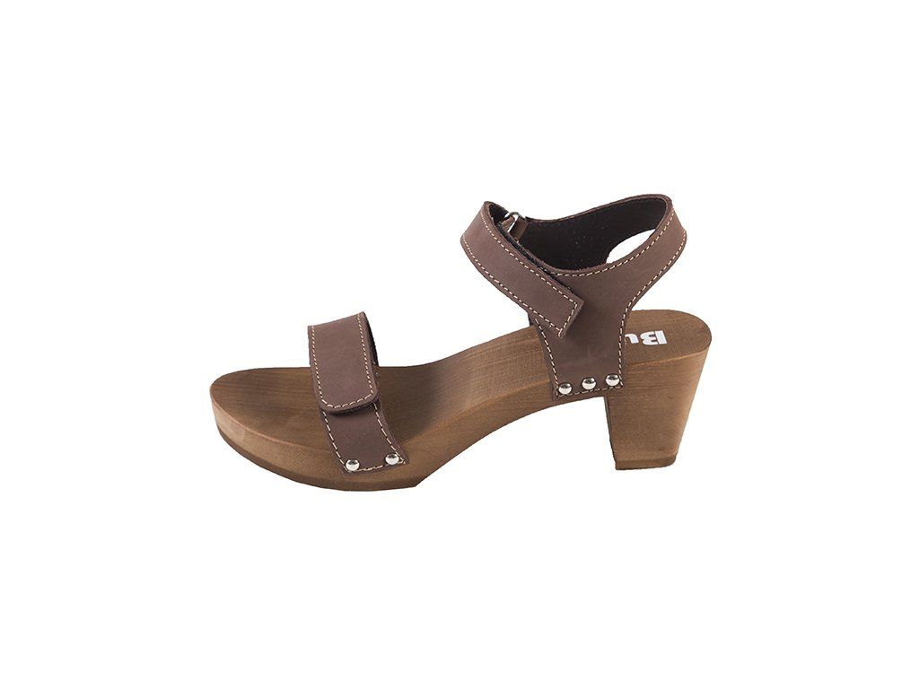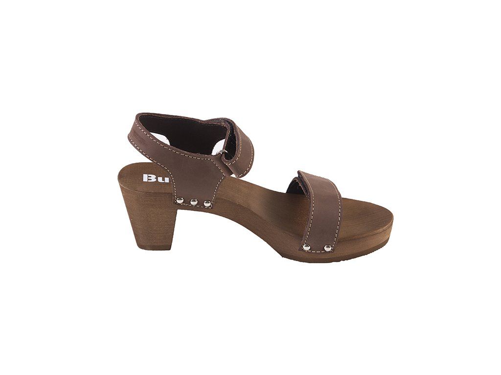 Ezek az elegáns szandálok könnyű hársfából és valódi, dupla természetes bőrből készült felsőrésszel készülnek, amelyet ízléses fém szegecsek rögzítenek a fa talprészhez. A tépőzáras bőrpántok biztosítják a lábbeli könnyű beállítását és kényelmes rögzítését a lábon. A fa talp formázása a felsőrész állítási lehetőségével együtt stabil és kényelmes alátámasztást biztosít a lábnak, ami hozzájárul a helyes testtartáshoz. A hosszanti boltozat formázása segíti a lúdtalp megfelelő tartását. A fa és a bőr tulajdonságai biztosítják a megfelelő nedvszívást, így a láb nem izzad be.