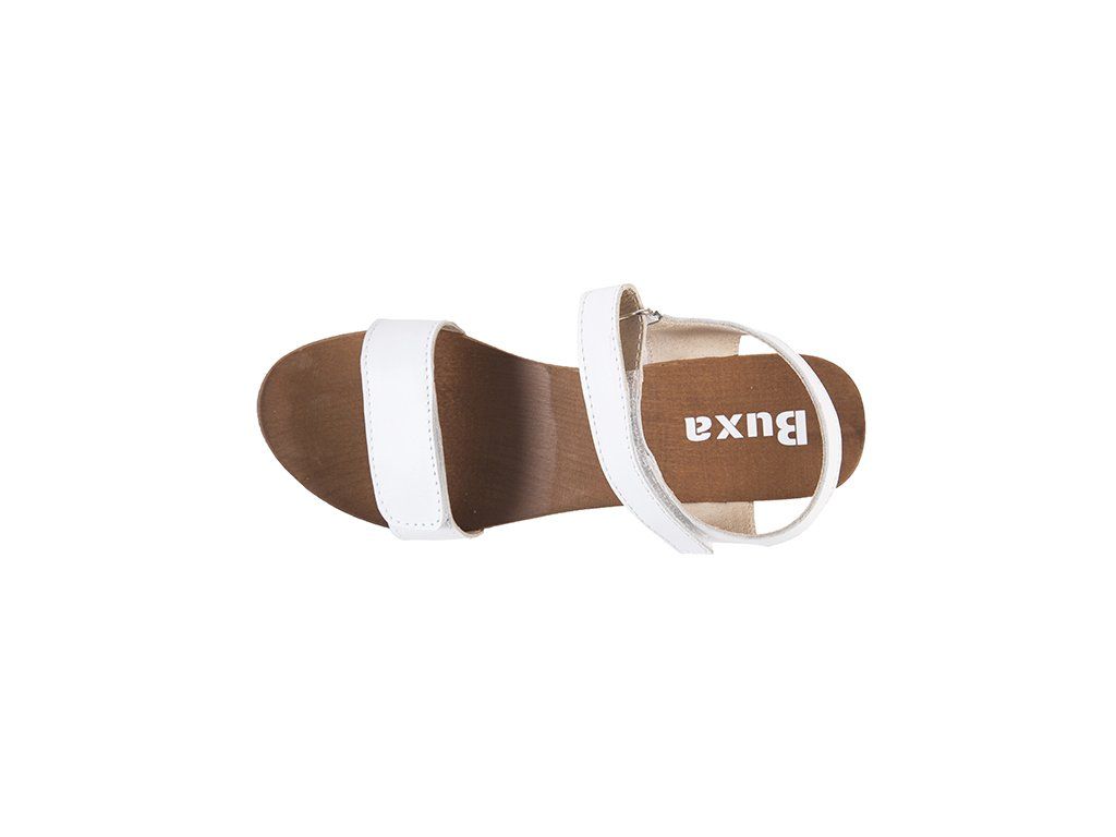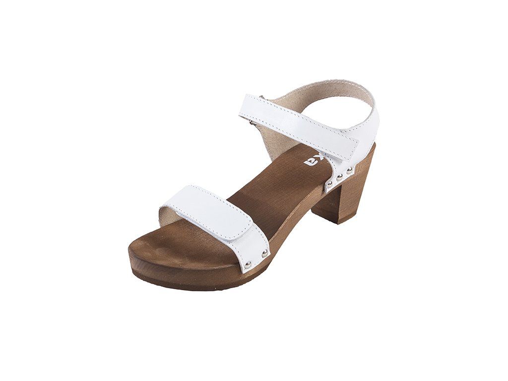Ezek az elegáns szandálok könnyű hársfából és valódi, dupla természetes bőrből készült felsőrésszel készülnek, amelyet ízléses fém szegecsek rögzítenek a fa talprészhez. A tépőzáras bőrpántok biztosítják a lábbeli könnyű beállítását és kényelmes rögzítését a lábon. A fa talp formázása a felsőrész állítási lehetőségével együtt stabil és kényelmes alátámasztást biztosít a lábnak, ami hozzájárul a helyes testtartáshoz. A hosszanti boltozat formázása segíti a lúdtalp megfelelő tartását. A fa és a bőr tulajdonságai biztosítják a megfelelő nedvszívást, így a láb nem izzad be.