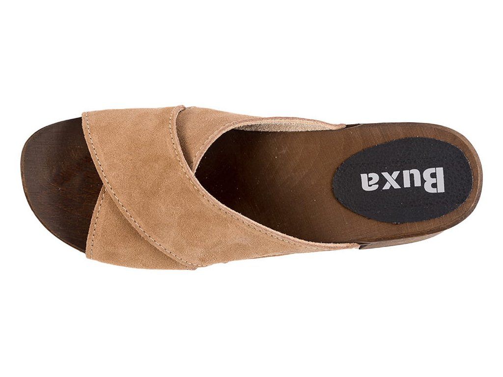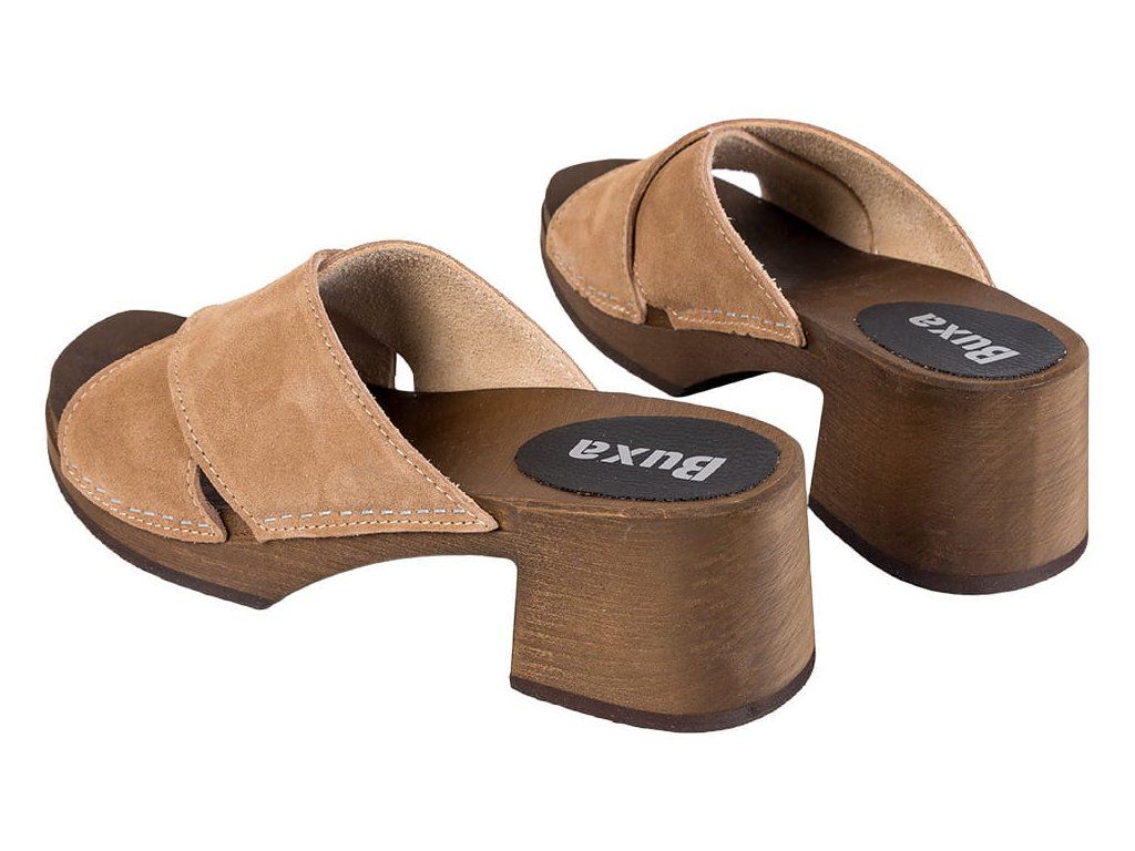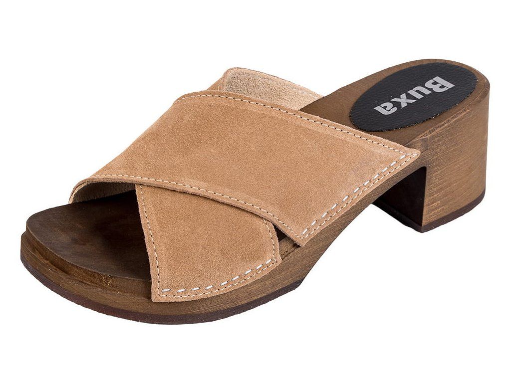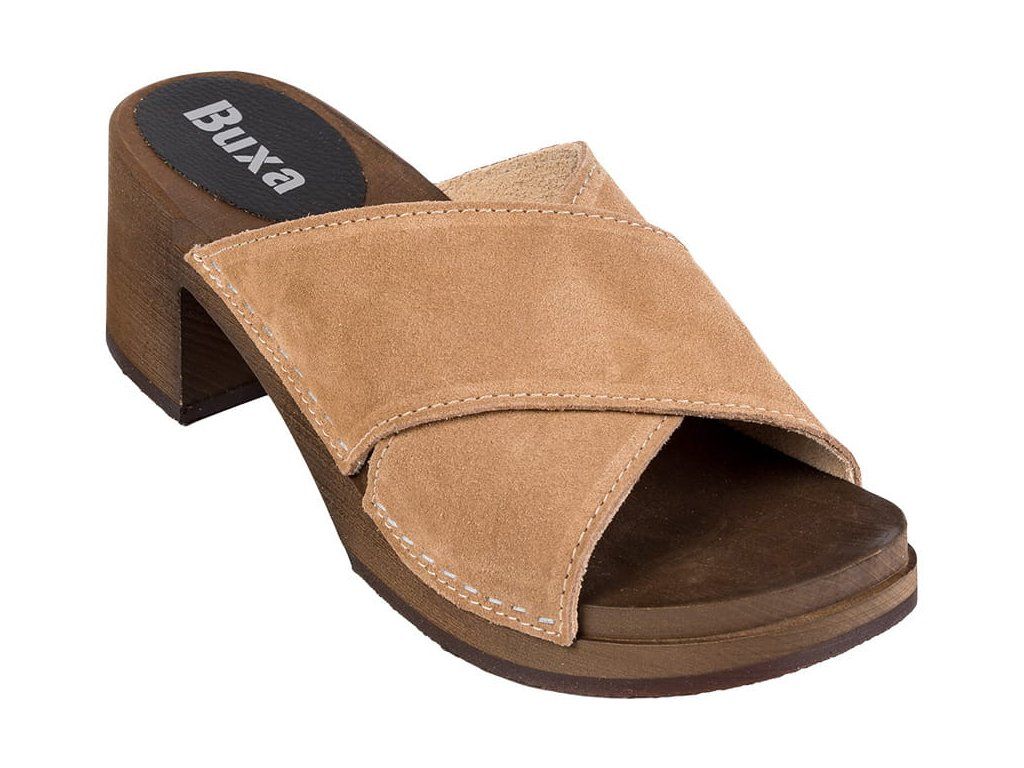 Elegáns klumpa szélesebb sarokkal, két bőr pánttal és hársfából készült fa talppal. Stabil járást biztosít, kényelmes hosszabb viselés során is, és ideális modern öltözékhez vagy mindennapi viselethez.