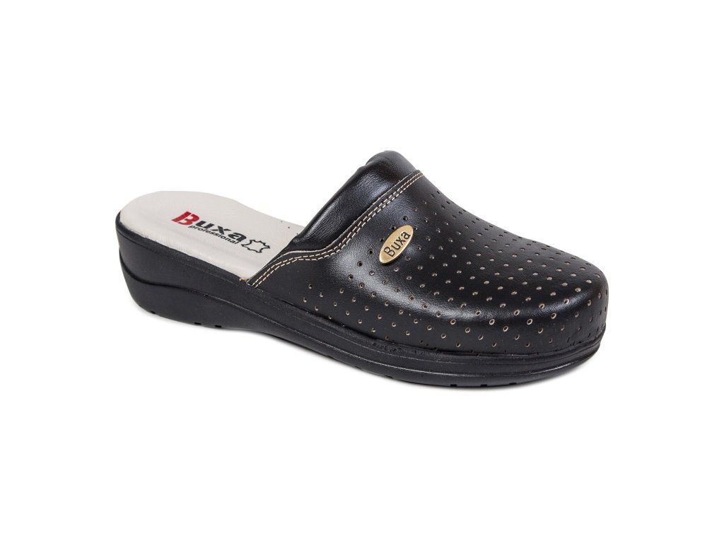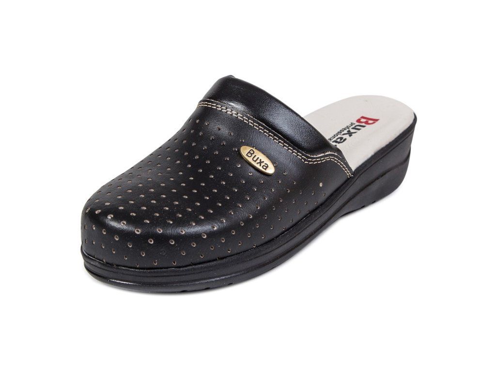 Női teljes bőr egészségügyi papucs, a sarokrészben elhelyezett ütéscsillapító betéttel, amely járás közben tompítja az ütéseket. Az egyedülálló, a talp sarokrészében található amortizációs betét csökkenti a gerinc és az ízületek terhelését, és növeli a járás komfortját. Ez a modell puha, anatómiailag formázott talpbetéttel rendelkezik, amely támogatja a haránt- és hosszanti boltozatot, valamint a lábujjakat. Zárt orrésszel készült, amely a jobb szellőzés érdekében perforációval van ellátva.